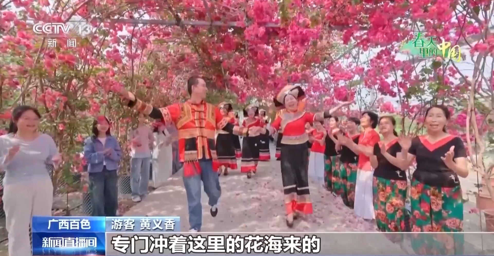 作为百色市市花,三角梅花期绵长、花色艳丽、适应性强,已然成为城市绿化景观的核心花卉。在百色市四塘苗圃里,各色三角梅层层叠叠、竞相怒放,花团锦簇,蔚为壮观。身着民族服饰的市民们唱着山歌,不少游客也纷纷加入,感受独特的民俗风情和春日胜景。
