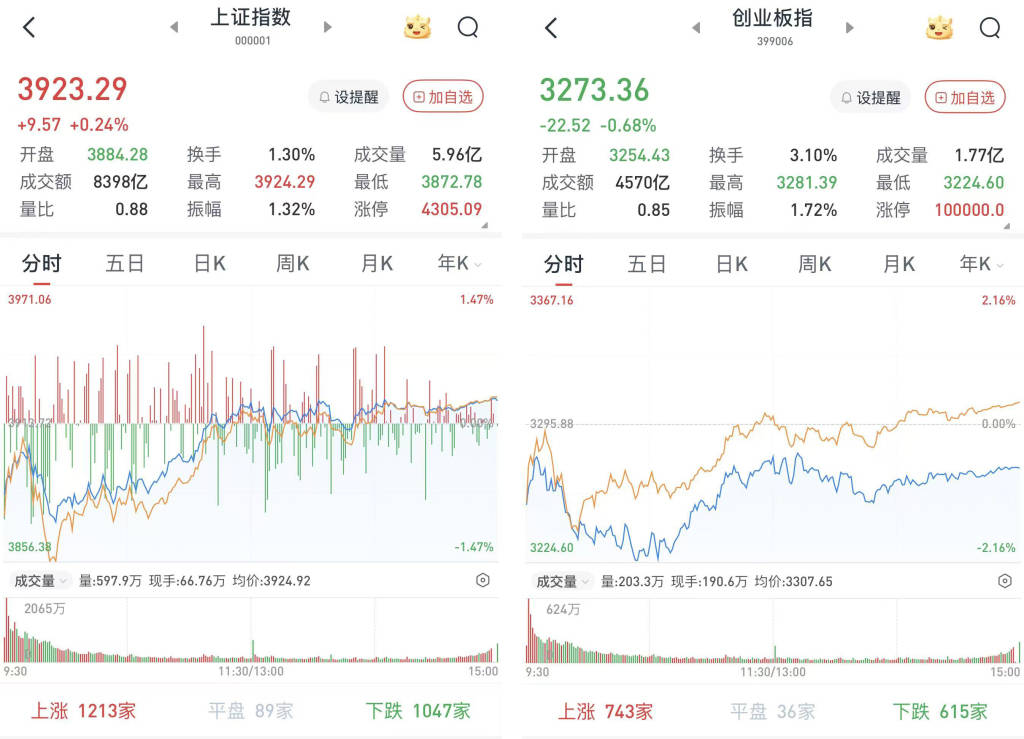 至收盘,上证综指涨0.24%,报3923.29点;科创50指数跌0.84%,报1289.78点;深证成指跌0.25%,报13726.19点;创业板指跌0.68%,报3273.36点。
