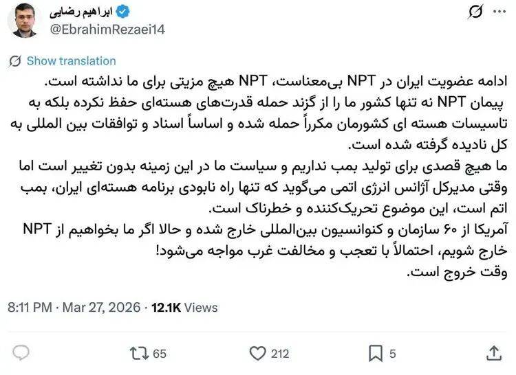 伊朗议会国家安全与外交政策委员会发言人易卜拉欣·雷扎伊就相关事件表示,伊朗正在考虑退出《不扩散核武器条约》。他指出,《不扩散核武器条约》不仅未能保护伊朗免受核大国袭击,反而使伊朗核设施多次遭到攻击,国际文件和协议也遭到完全忽视。