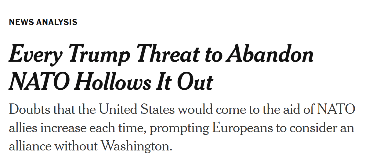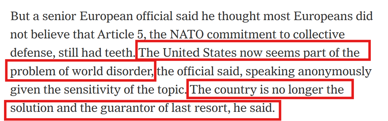 报道称,一位不愿透露姓名的欧洲高级官员指出,大多数欧洲人已不再相信北约第五条(集体防御条款)还有实际效力。美国似乎已成为世界混乱的一部分,而不再是解决方案和最后保障者。
