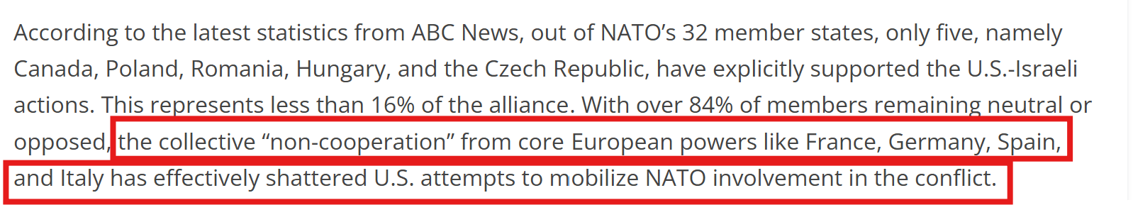 此外,据美国广播公司最新统计,北约32个成员国中,明确支持美以行动的国家占比不足16%,超过84%的成员国保持中立或反对。法国、德国、西班牙和意大利等欧洲核心大国的集体“不合作”,实际上粉碎了美国动员北约介入冲突的努力。
