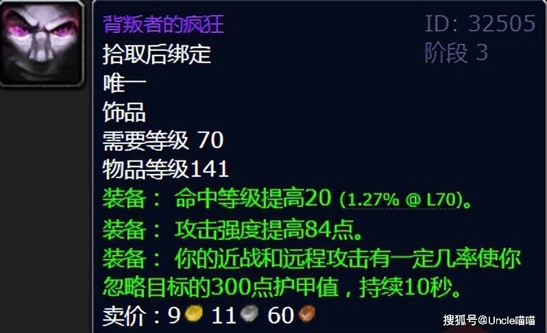 如果说古尔丹之颅是法系的信仰,那么背叛者的疯狂就是物理系的“心头好”。这件由黑暗神殿伊利达雷议会掉落的饰品,凭借独特的破甲机制,成为了战士、潜行者等物理输出职业的三阶段毕业选择。