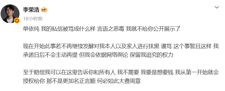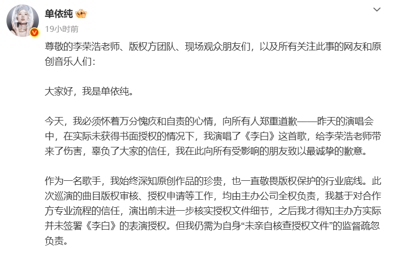 3月29日,歌手李荣浩在个人社交媒体公开喊话歌手单依纯在28日的深圳演唱会上,在其方已明确拒绝授权的情况下,仍“强行侵权”翻唱其歌曲《李白》。单依纯于次日凌晨致歉,称授权事宜由主办方全权负责,自己因疏忽未亲自核查,愿承担全部责任与赔偿。李荣浩回应称不需要赔偿,但对其遭受的网络暴力表示不满。事件引发公众对歌曲版权问题的讨论。