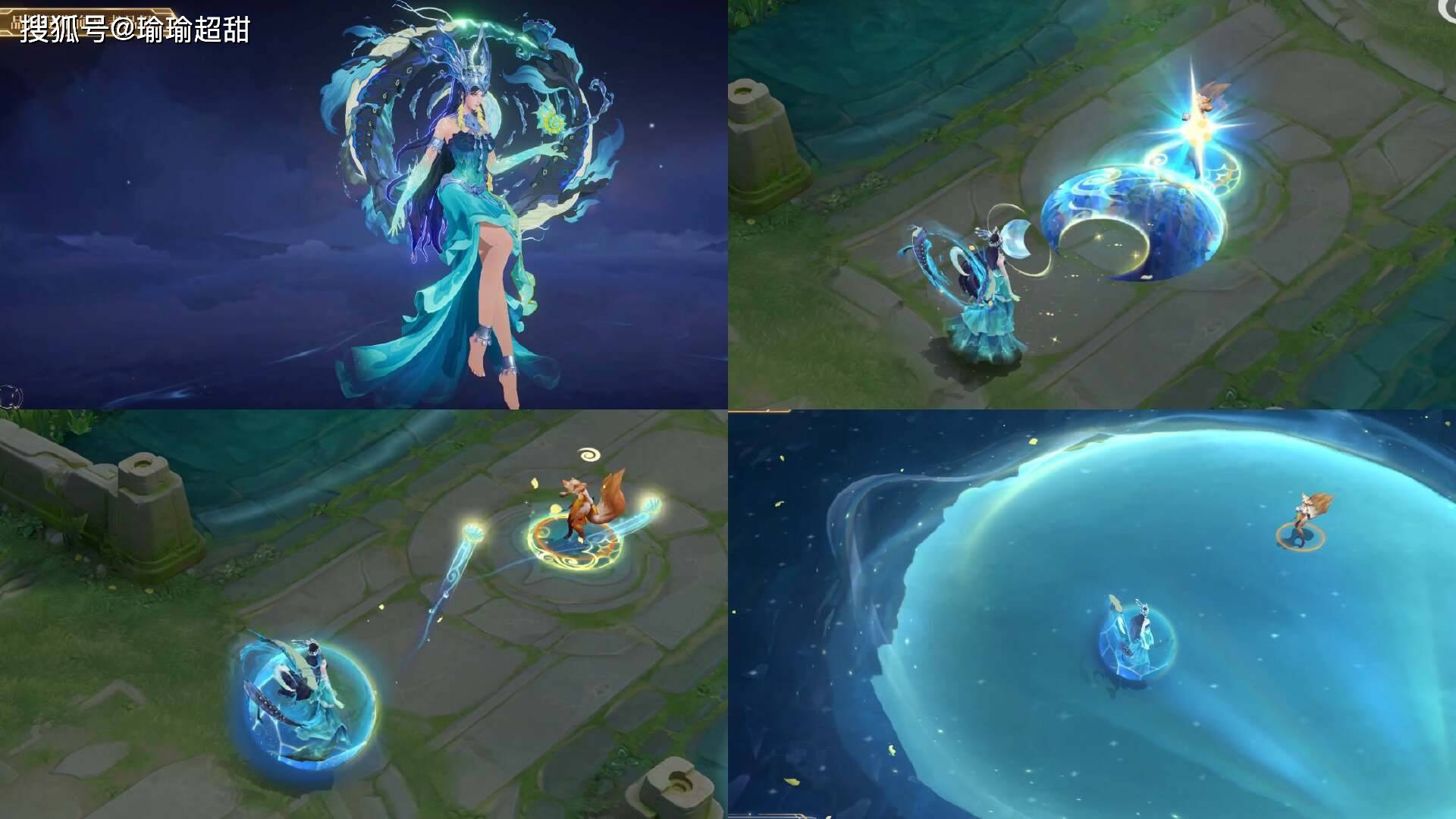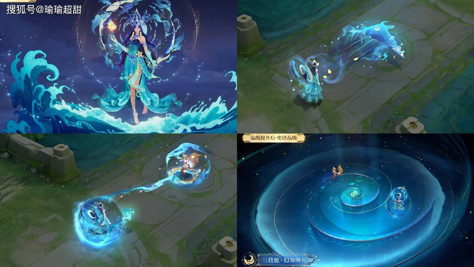二技能的变化也非常大,可以看到攻击的时候有海水进行攻击,效果也是非常不错的。当然了,最重要的还是三技能特效,可以说是所有海月皮肤里面最独特的一款,因为里面虽然是一个海水元素,但是展现出了一种 3D 视觉感,相比海月其他皮肤的大招特效,这款皮肤的大招视觉效果绝对是最独特的。