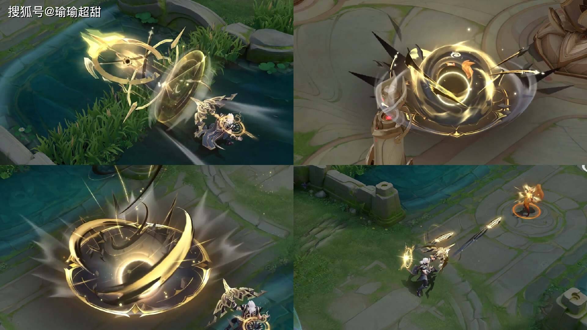 如图所示,在施法之后,可以看到整体的表现主要就是以暗金色为主要色彩,然后在技能爆炸之后可以看到有一些黑洞一样的设计,比如说二技能和三技能,都可以看到有黑洞一样的设计。